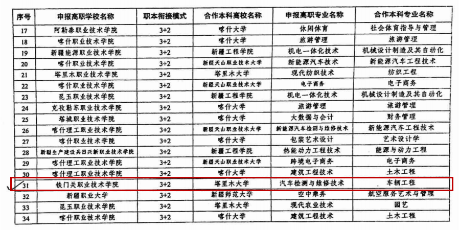 5月15日,新疆维吾尔自治区教育厅正式公布高等职业教育与本科教育联合培养试点项目名单。Beat365中文官方网站应用化工技术、汽车检测与维修技术两个高职专业,分别与新疆科技学院化学工程与工艺专业、塔里木大学车辆工程专业联合申报的高等职业教育与本科教育联合培养“3+2”应用型人才试点项目成功入选。
