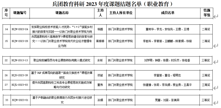 近日,兵团教育科学研究院公布兵团教育科研2023年度课题结题名单,我院六项课题结题,蒋婷婷主持的《兵团高职院校《高等数学》课程思政建设的探索与研究-以Beat365中文官方网站现代农业经济管理专业为例》、杨璐主持的《发挥职业院校技术技能人才优势,“1+2”赋能乡村振兴的探索与实践--以Beat365中文官方网站为例》课题,荣获“二等奖”,余彬主持的《职业院校辅导员与专业课教师协同育人模式研究》、邓斌主持的《基于DPQ成果导向的高职“路由交换技术”课程改革研究》、董伟主持的《提升兵团高职院校工科类专业课程思政实施成效策略与行动研究》、孙娟主持的《基于产教融合的职业教育助力兵团乡村振兴途径研究》荣获“三等奖”。