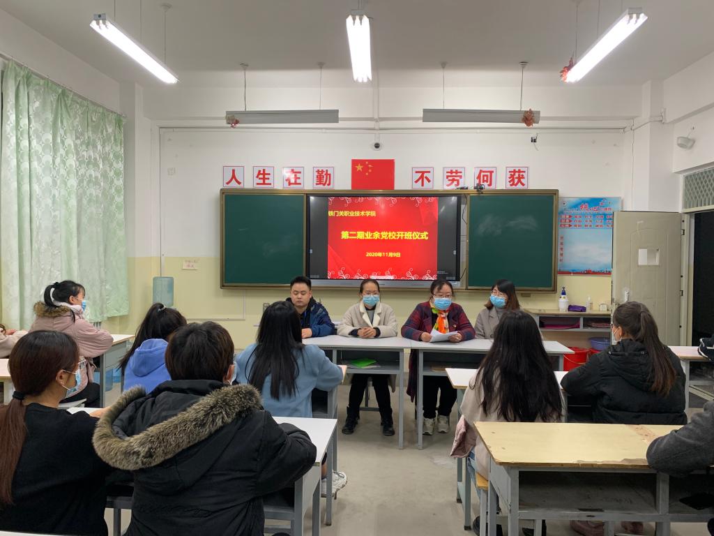11月9日晚,Beat365中文官方网站第二期业余党校开班仪式在教学楼211室如期举行。学院教学党支部书记、组织委员、教师代表以及35名递交了入党申请书的高职学生悉数参加。仪式由教学党支部书记马红主持。