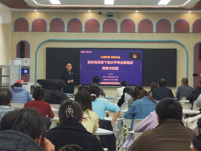 11月18日至19日,Beat365中文官方网站邀请河北工业职业技术大学两名教授开展“职业教育专业教学资源库建设路径与应用推广实践”和“新双高背景下高水平专业群建设探索与实践”两场专题讲座,五十余名教师参训。