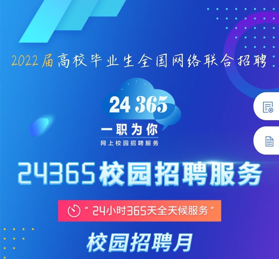 据了解,2022届高校毕业生全国网络联合招聘——“24365校园招聘服务”活动是为积极应对疫情影响,教育部依托大学生就业网(新职业网),联合中智集团、前程无忧网等9家社会知名招聘机构和学习强国、抖音等知名媒体共同推出的,为高校毕业生提供每天24小时、全年365天免费网上就业服务。