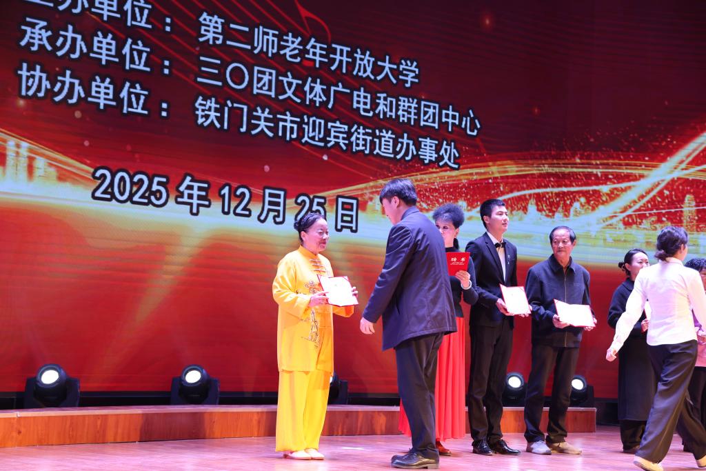 冬日暖阳映初心,银龄逐梦展风采。12月25日,第二师老年开放大学2025年度教学结业展演在第二师铁门关市三十团双丰镇职工文化活动中心举行。本次活动由第二师老年开放大学主办,三十团文体广电和群团中心承办,铁门关市迎宾街道办事处协办,集中展现了老年学员一年的学习成果与积极向上的精神风貌。