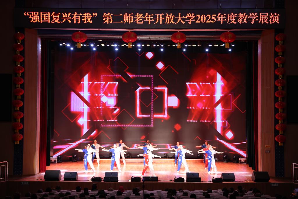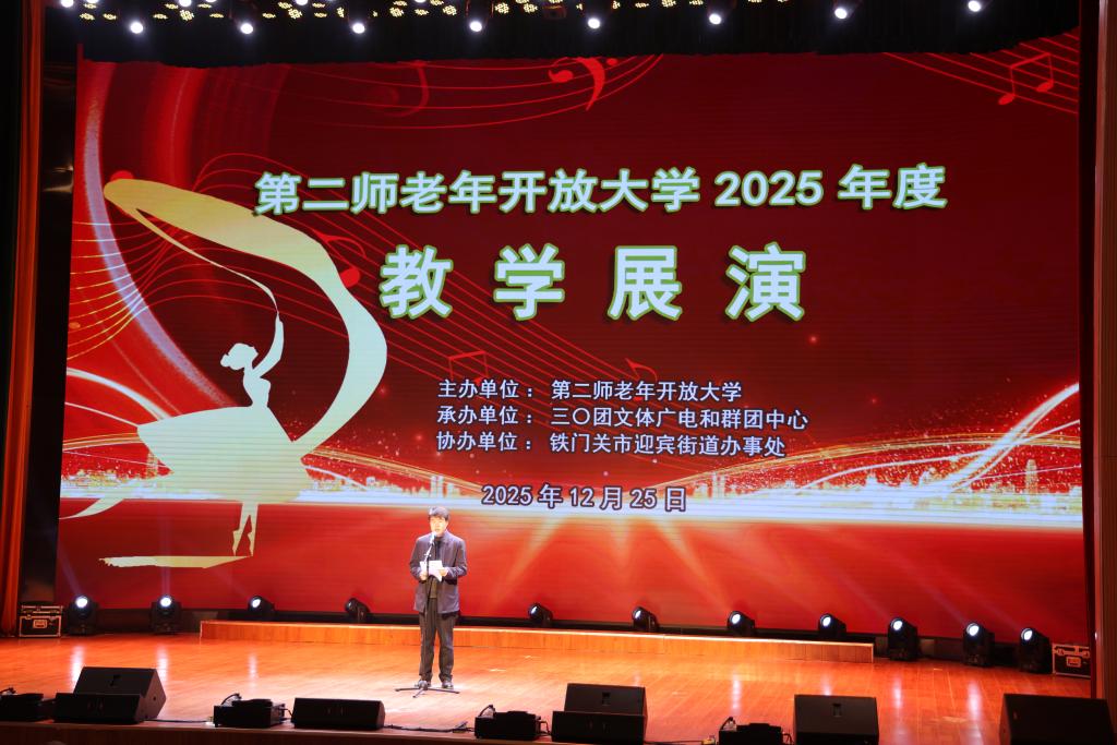 展演伊始,学院领导对老年开放大学2025年度教学工作给予充分肯定,向辛勤耕耘的教师和班主任致以诚挚谢意,并向顺利结业的学员们表示热烈祝贺,勉励全体老年学员永葆学习热情,在终生学习中收获更多快乐与成长。