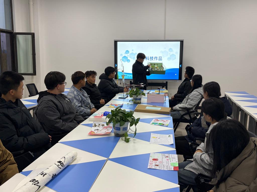 系列活动首先开展了科创作品汇报展示。党支部师生围绕本年度科创比赛主要备赛方向进行汇报,对参赛作品进行介绍,并互相评价。其中,24级应用化工五年制1班学生包旭东展示了自己的“基于可控制状态下改进浓酸与金属(固体与液体)反应环保装置”科技小发明。在交流环节,他说:“从最初纸上的想法,到一步步把它变成实物,这个过程虽然不容易,但让我对知识的理解更深了。”