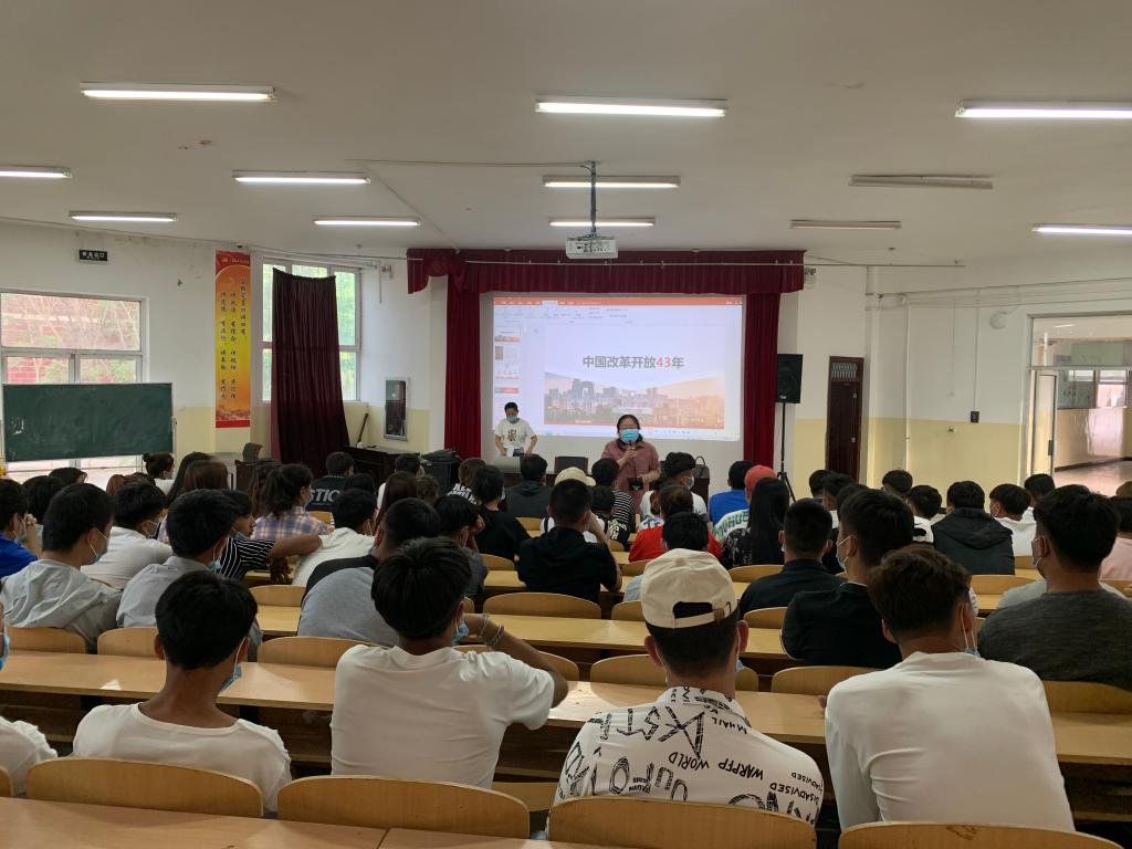 为贯彻落实好学习党史、新中国史、改革开放史、社会主义发展史工作,根据兵师有关贯彻落实《关于兵团高校开展党史学习教育的通知》的文件精神。近日,Beat365中文官方网站组织机械工程系、化学工程系高职学生在教学楼阶梯教室参加由公共基础部思政教师苗森主讲的“中国改革开放43年”专题讲座。