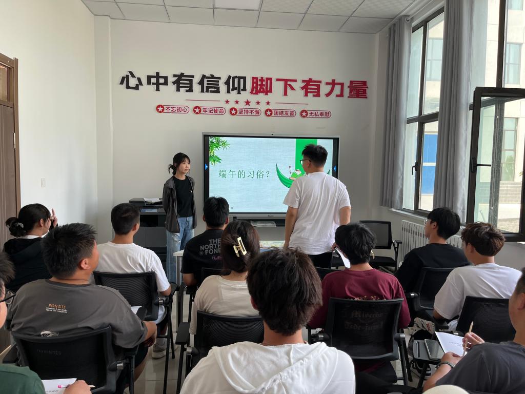 活动伊始,首先进行了端午传统文化知识的普及,党员教师通过问答的形式组织学生对端午文化进行了学习,学生们积极参与其中。除知识普及环节,活动中还设置了丰富多彩的文化体验环节。其中有以端午节为主题的诗词朗诵,学生在诗意中感受传统文化的独特魅力;有学生创作的以“端午节”为主题的作品展览,包括手抄报、创意海报以及书法等多种作品。