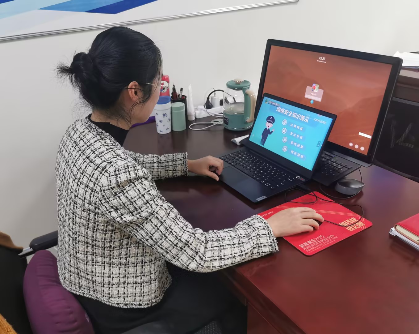 活动中,纪检监察办公室主任带领大家学习深入宣传贯彻习近平总书记关于网络强国的重要思想的讲话精神,并结合自身工作实际,通过讲解身边发生的真实案例的方式,现场为大家普及了网络安全知识。随后,大家共同学习了《网络安全法》等相关网络安全条例、观看网络安全视频,引导干部们树立网络文明意识、增强网络道德观念、自觉遵守网络道德规范。最后,纪检监察办公室全体干部签订网络安全倡议书,承诺自觉做到安全上网、文明上网、依法上网、绿色上网。
