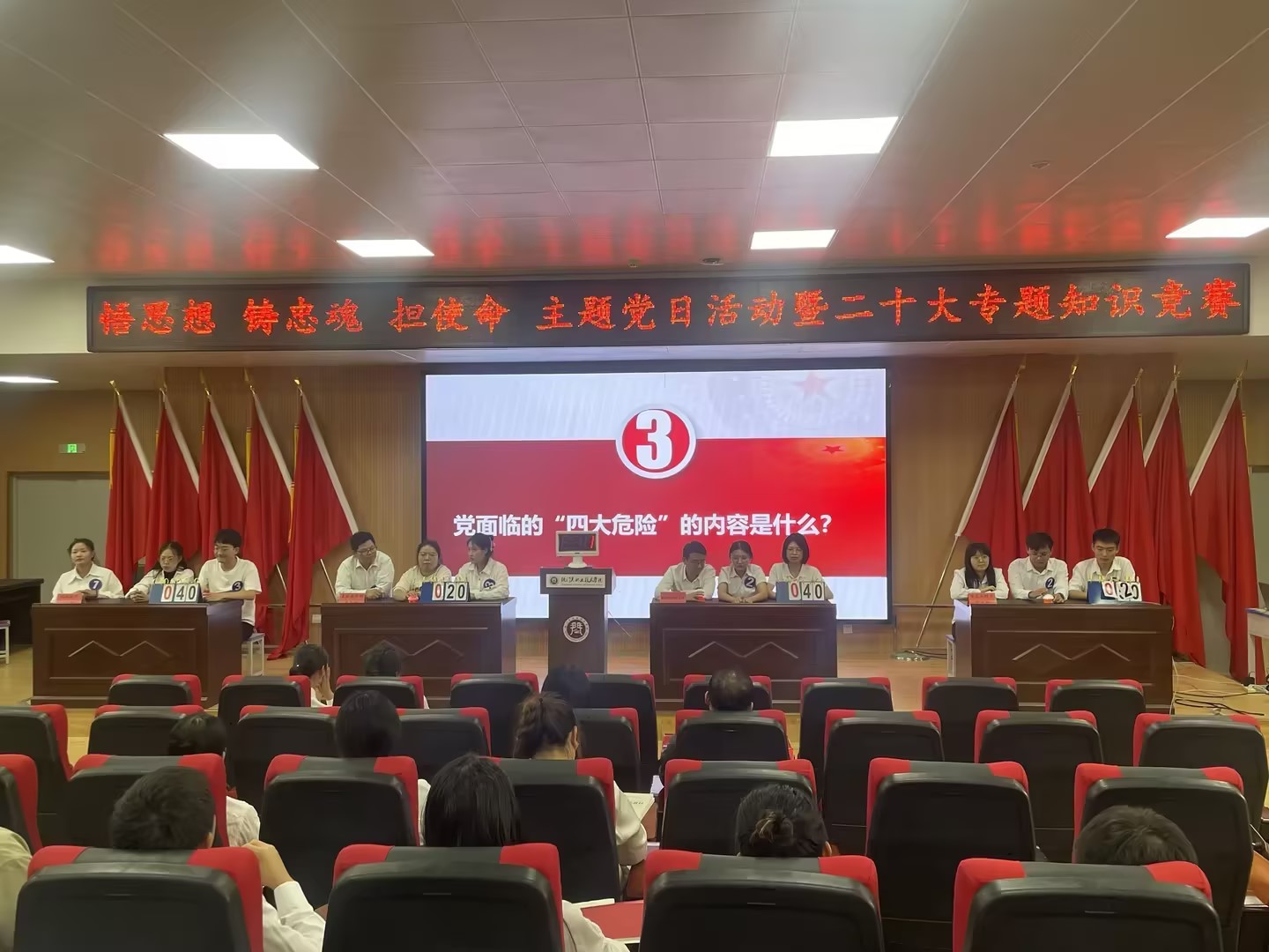 学习环节结束后,围绕主题教育第一次集中学习内容,举行了党的二十大专题知识竞赛。各党支部分别选出3名党员组成4个参赛队,本次竞赛共分为必答题、抢答题和风险题3个环节。选手们摩拳擦掌、你追我赶,赛场上气氛热烈、高潮迭起、掌声不断。通过激烈角逐,最终教学科研党支部拔得头筹,获得第一名的好成绩。比赛结束后,党员们纷纷表示,要切实加强党的理论学习,提高主动性和创新性,增强使命感和责任感,熟读精读党的二十大报告,坚定历史自信,增强历史主动,谱写新时代中国特色社会主义更加绚丽的华章。