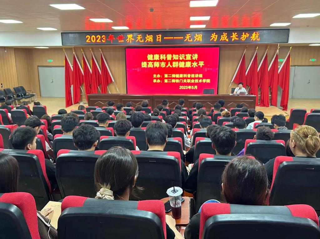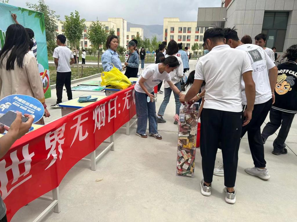 活动现场悬挂宣传横幅。第二师卫健委和第二师疾病预防控制中心工作人员结合今年宣传主题,通过有奖问答等形式,围绕“吸烟有害健康”“二手烟的危害”等主题举办了健康知识讲座,向学院师生普及烟草对健康的危害,动员他们主动戒烟,共筑美丽健康家园,共计200余名师生代表参与。