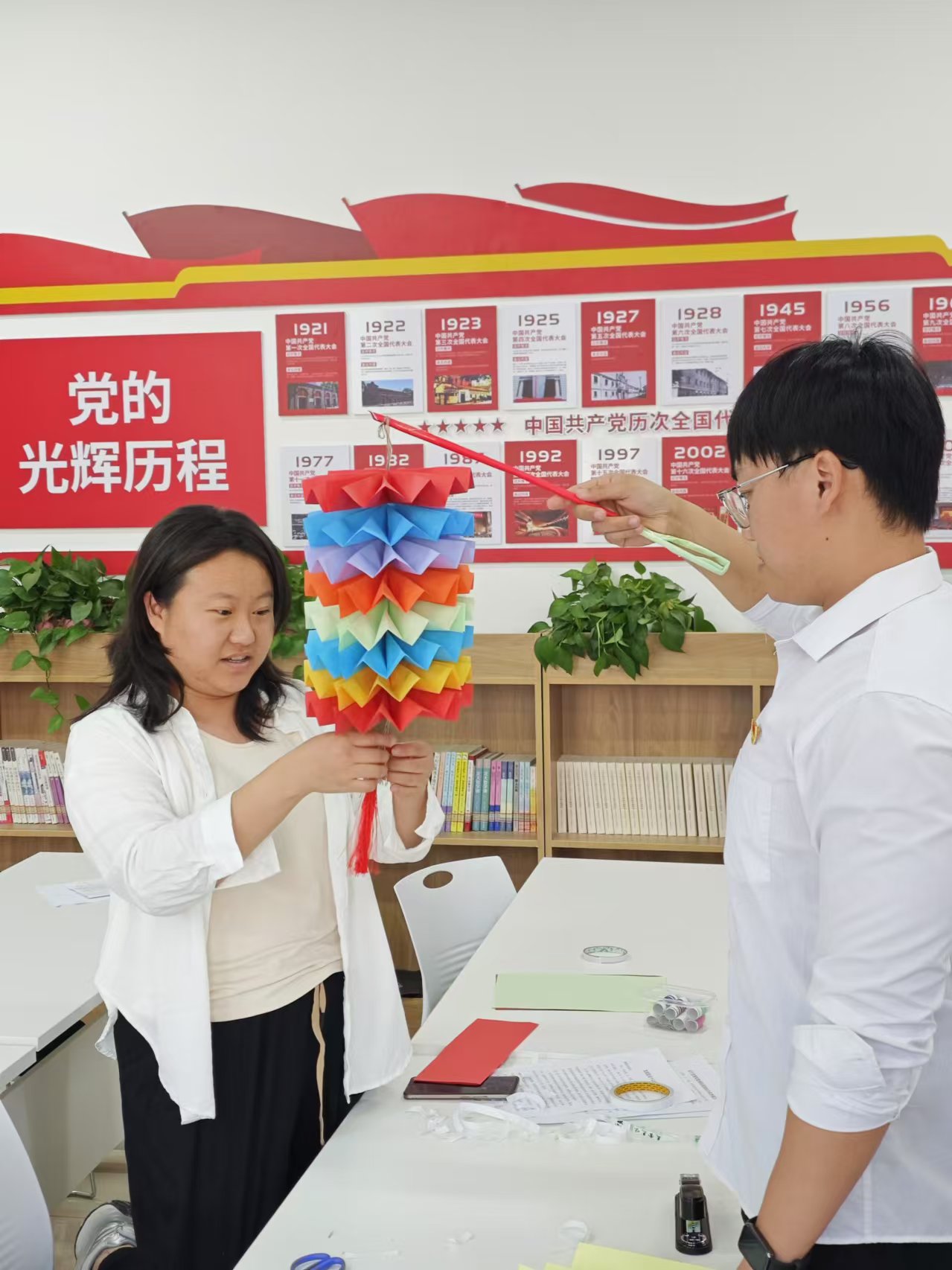 随后,在灯笼制作环节,每位党员准备材料包,包括彩纸、剪刀、胶水等,在支部委员的示范和指导下,按照制作步骤认真制作灯笼,经过裁剪、折叠和粘贴等环节,一盏盏精美别致的灯笼在党员们的巧手中逐渐成型,这些灯笼不仅形态各异、色彩斑斓,更蕴含了大家对中秋佳节的美好祝愿。
