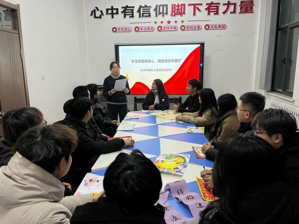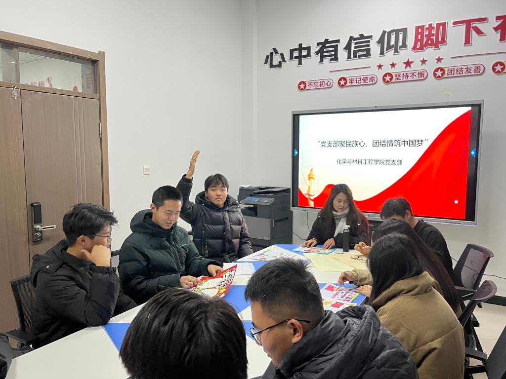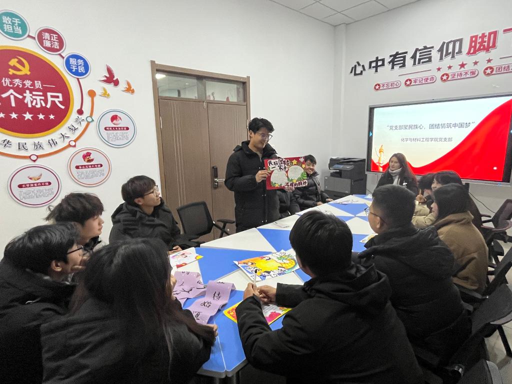 为促进校园民族团结、营造和谐友爱氛围,让各族学生在共享文化的同时,更加坚定维护民族团结的决心,Beat365中文官方网站化学与材料工程学院党支部12月16日下午在精技楼100会议室组织了一场以“党支部聚民族心 团结情筑中国梦”为主题的教育活动,共计2名党员教师和20名学生入党积极分子参加。