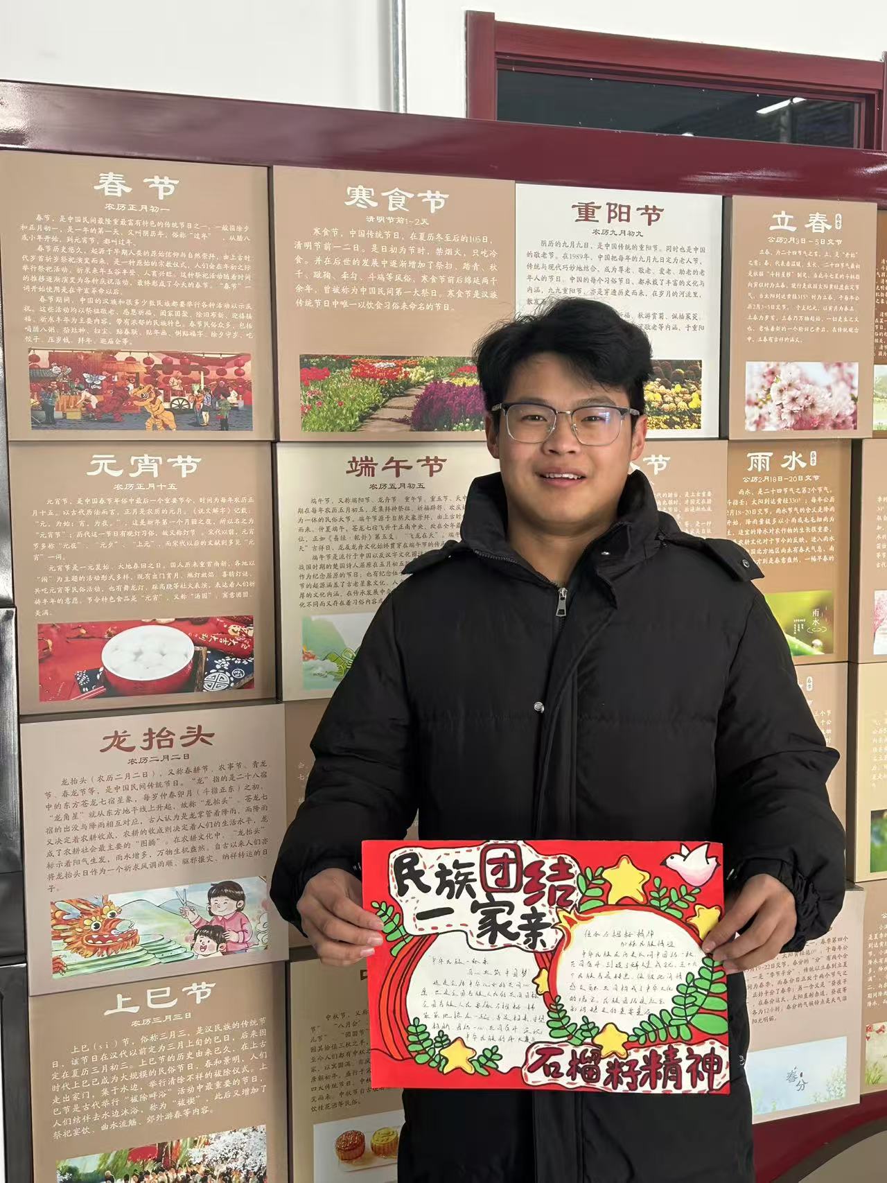 学生入党积极分子们则热情高涨地参与到活动的每一个角落。他们用生动的语言向同学们介绍自己制作的民族的色展品,有手抄报,软笔书法,硬笔书法,对联等作品;2023级油气储运技术1班学生刘超旭分享了自己所了解的民族故事,通过孔繁森——藏区的 “活菩萨”和王昭君出塞的故事,使大家真切地感受到了各民族间血浓于水、亲如一家的深厚情谊。