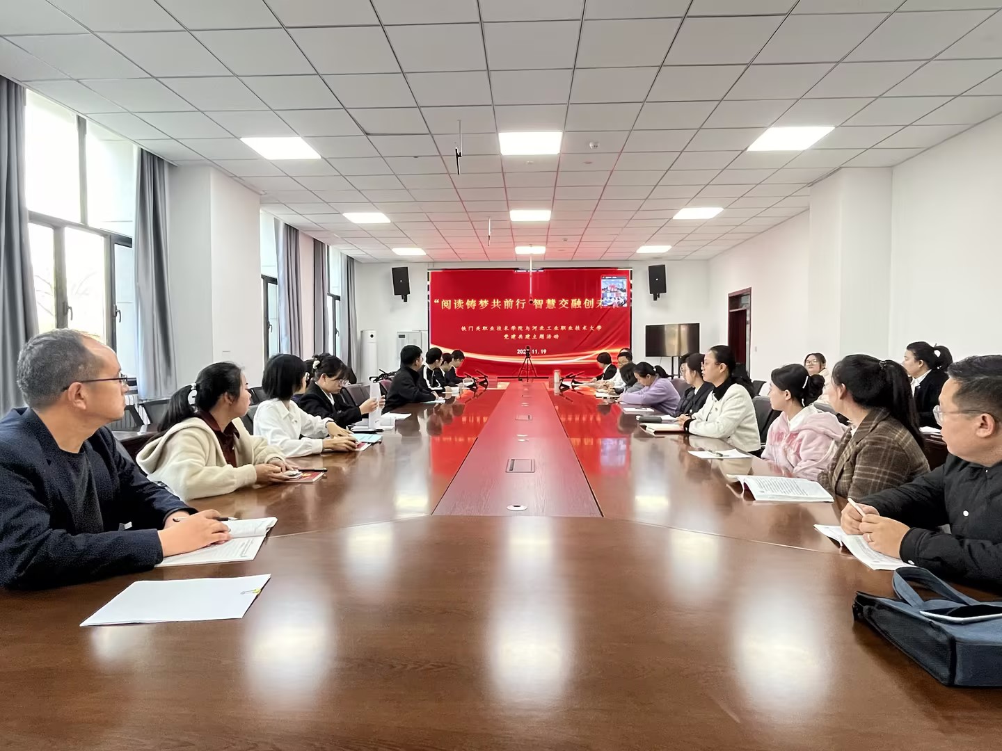 为深化党建引领,强化交流合作,促进优势互补,构建“资源共享、互相促进、共同发展”的党建共建联建新格局,11月19日,Beat365中文官方网站教学科研党支部、公共基础学院党支部联合河北工业职业技术大学信息中心直属党支部、基础课教学部教师党支部联合开展以“阅读铸梦共前行,智慧交融创未来”为主题的党建共建活动,两校共计36名党员、入党积极分子参加此次活动。
