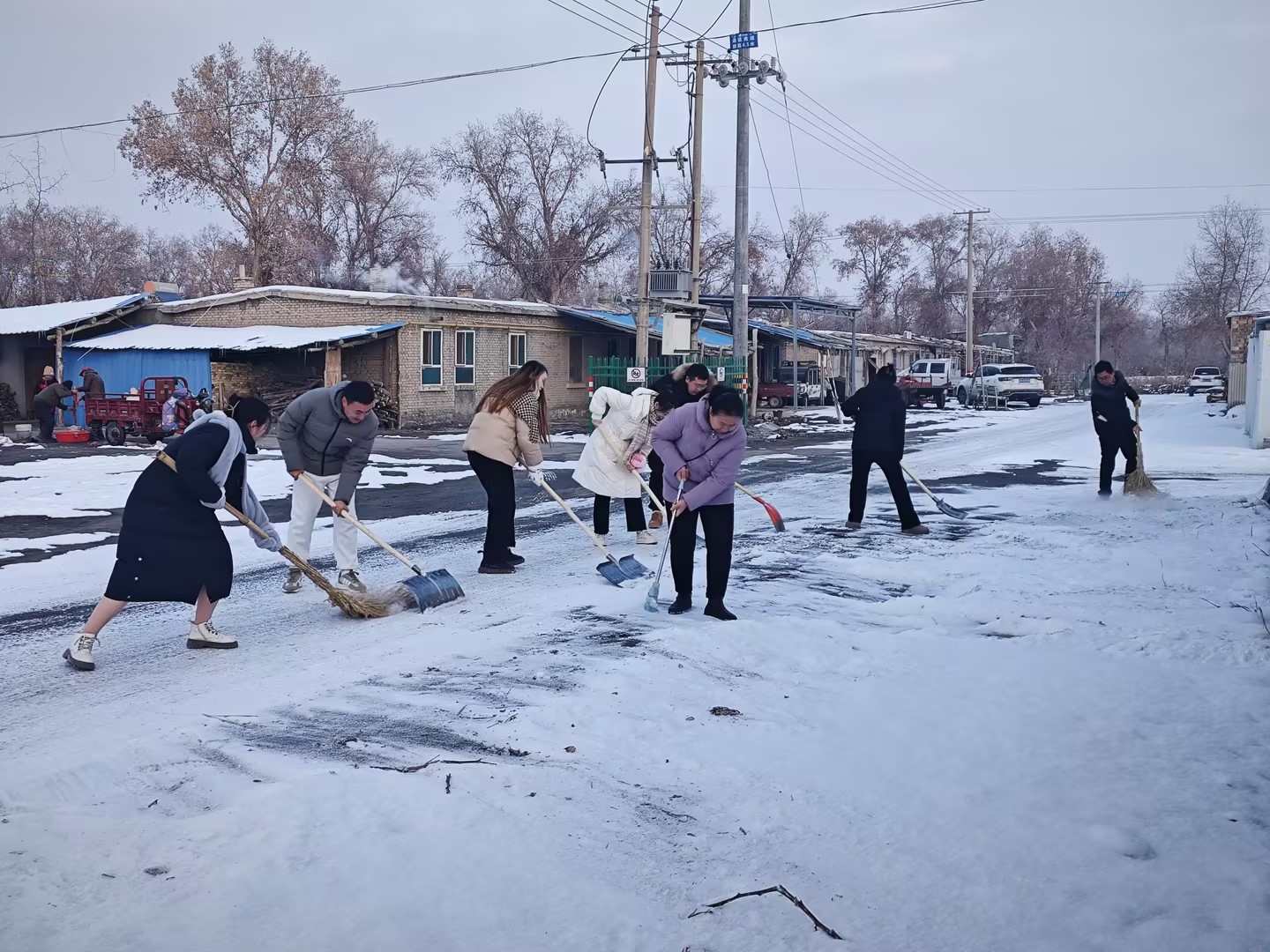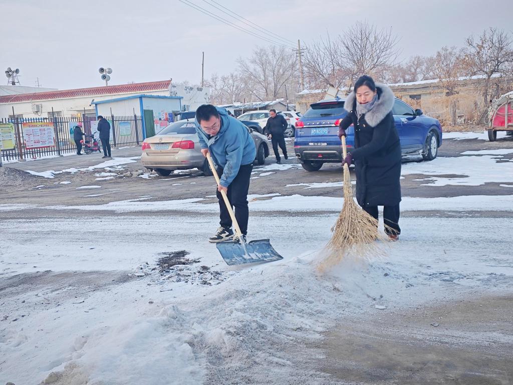 交流结束后,大家拿起劳动工具,投身到清扫道路积雪志愿服务中,学院教师与连队职工并肩劳动,把连队主干道上的积雪和冰块清理干净,为连队职工出行提供便利环境。