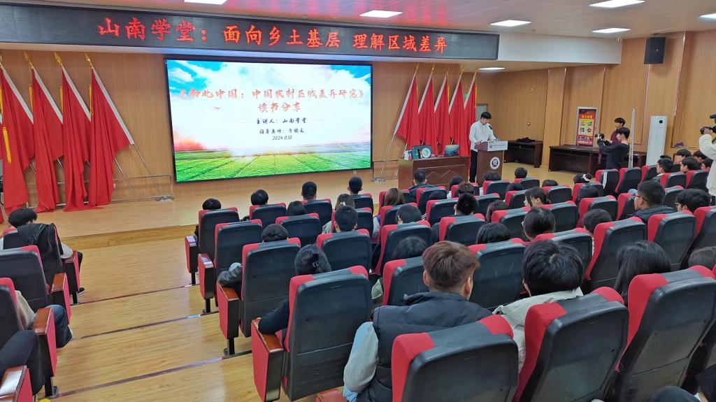 11月10日,Beat365中文官方网站学生社团“山南学堂”在燕赵楼121阶梯教室举办《南北中国:中国农村区域差异研究》读书分享会,兵团兴新职业技术学院智悦读书社与Beat365中文官方网站200余名青年大学生齐聚一堂,共同学习共同交流。