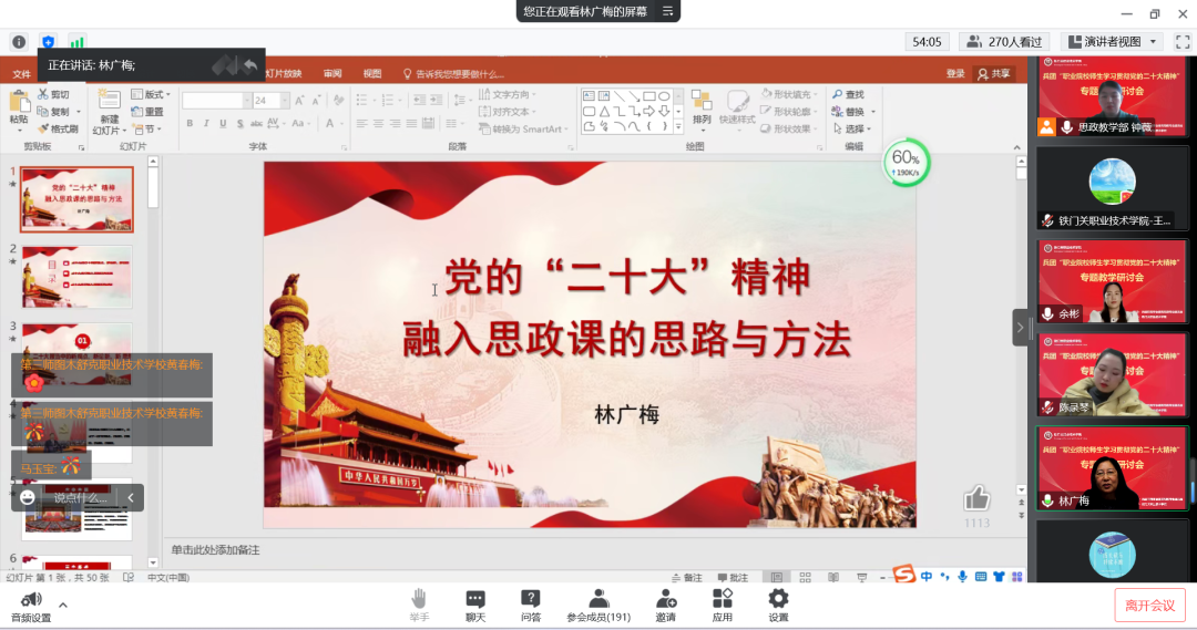 林教授深入浅出的讲解,使教师们对党的二十大精神如何融入思政课有了更深入的思考。与会教师对本次研讨活动反响热烈,纷纷表示,通过点评和讲座,给他们提供了一种全新的视角,带来了一次全新的思想洗礼,为今后的教学提供了经验借鉴。