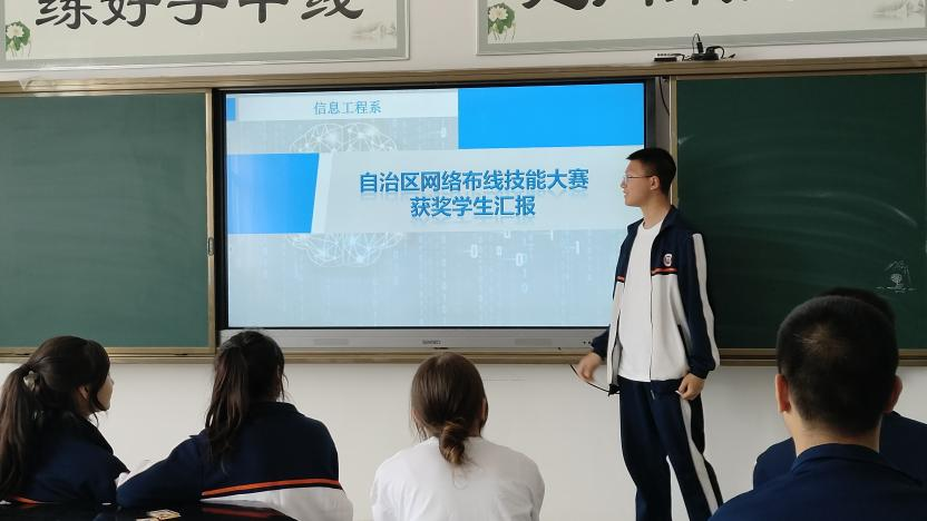 活动中,获奖学生走进班级,将他们比赛的过程、经验、成果和教训分享给大家,特别是下一届即将参赛的学弟学妹们,带动大家参赛的积极性和学习知识技能的热情。获奖学生还从参赛项目、如何备赛、赛时注意事项等方面与在场同学进行了交流,学生们积极参与,气氛热烈。