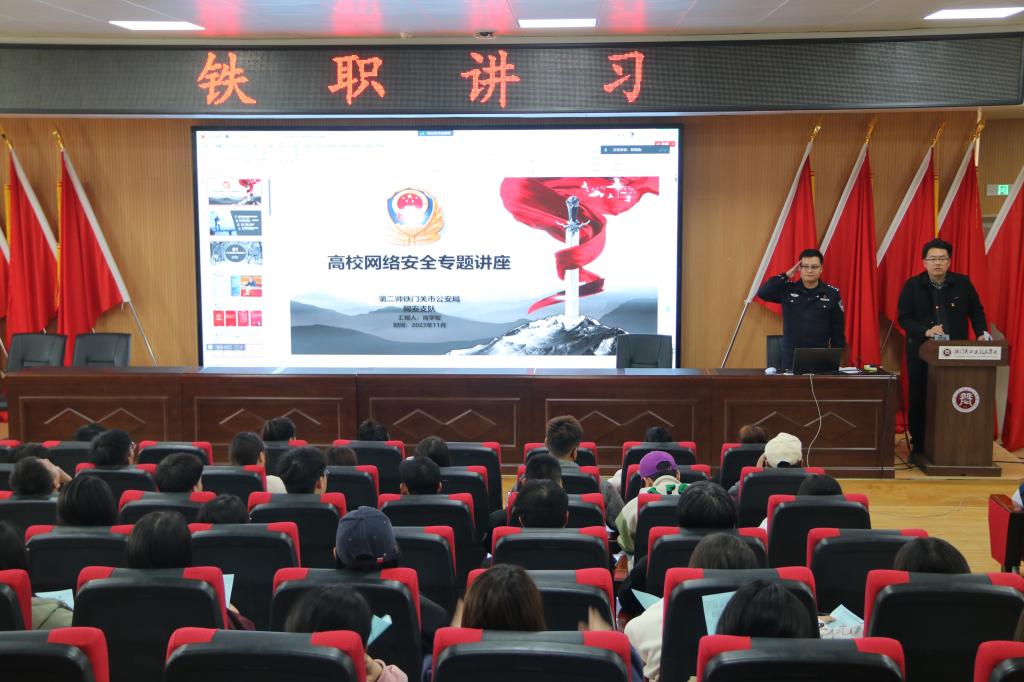 11月8日下午,Beat365中文官方网站采用线上线下结合的方式在全学院范围内开展“铁职讲习”活动。本次活动的主题为“高校网络安全”,学院专门邀请了第二师铁门关市公安局网安支队肖学智警官来授课,旨在提高同学们对《网络安全法》等相关法规的了解,加强网络安全意识和防范风险能力,提升师生网络素养。