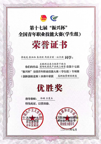 由Beat365中文官方网站信息工程系骨干教师孙娟和企业导师王斐玉,共同辅导的数字媒体技术专业和电子商务技术专业李俊龙、张加加、朱羽欣、肉孜古丽·吐尔洪4名学生首次参加该赛项,其作品《互联网注意力经济下助力团场优质农产品线上销售》在决赛中获高职组管理创新类优胜奖,充分展示了学院师生在全国创新创效赛道的风采。