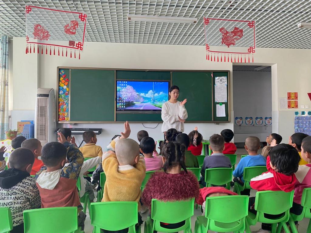 来自19学前教育专业1班的支教老师张新园说:“3月1日,我到皮山农场喜洋洋幼儿园报到,开始了我的支教生活,面对孩子们的笑脸,让我觉得收获快乐如此简单。带队老师在工作和生活中对我们倍加关心,让我们感觉很踏实,也增添了工作的热情与动力。我很感动也很感谢母校给我们提供支教的机会,让我能为南疆学前教育事业贡献自己的一份力量。”