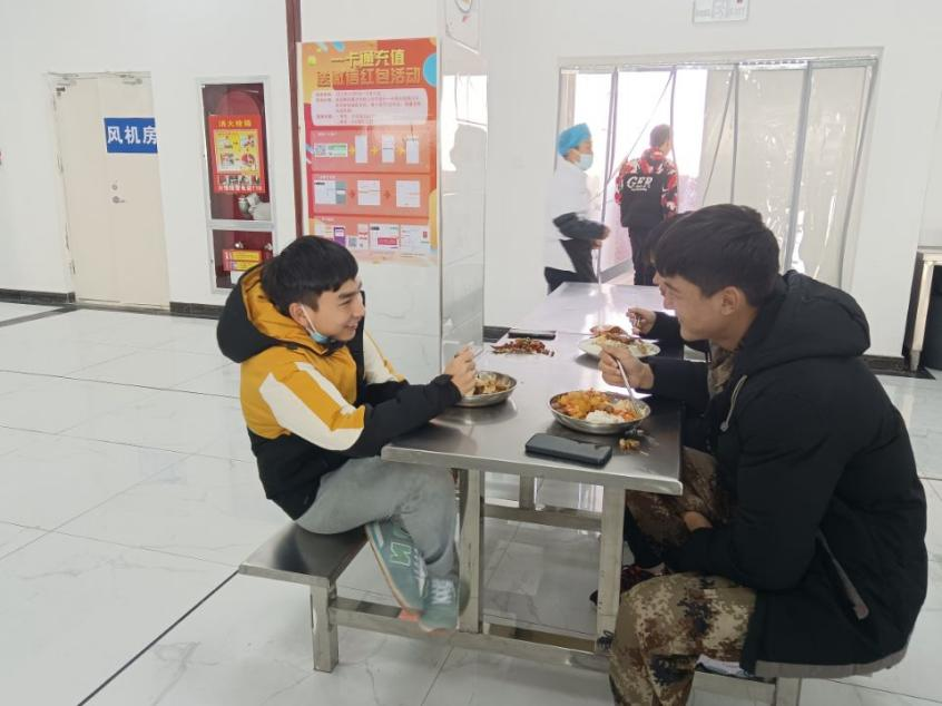 正午时分,走进食堂,教师们与交友学生同吃、同饮,相互交谈。老师不时询问大家饮食是否习惯、住宿是否舒适、生活中是否遇到问题等。21级计算机网络技术2班学生苏巴提·亚森开心地说:“与老师一起吃饭很开心,有利于缩短师生之间的距离,增进我们的情谊。”