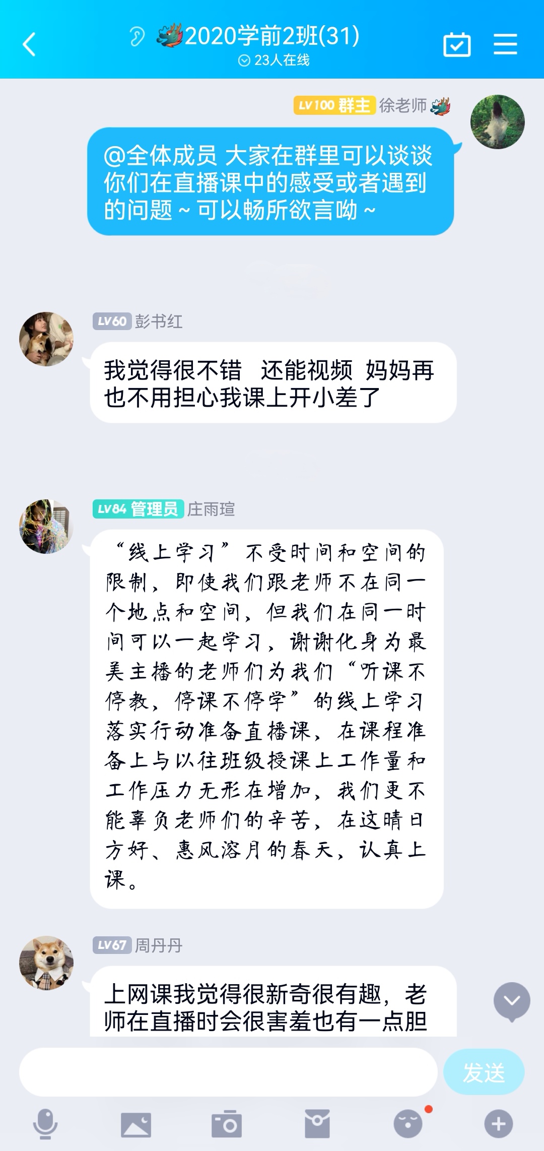 课程结束后,老师们与学生沟通交流,让大家提出宝贵意见和建议进行反馈,对当天课程的不足做以总结,认真反思,为下一次能更好的开展直播课做准备。