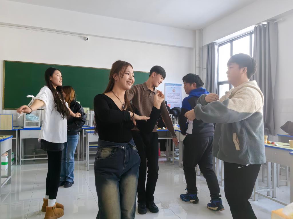 吃完饺子后,老师和学生们准备的文艺表演环节正式开始,节目内容丰富多样,包括歌曲、舞蹈、朗诵等。在文艺表演过程中,还穿插了多个趣味小游戏,如“击鼓传花”“踩气球”“抢凳子”等,同学们在游戏中释放压力,感受小组团队协作的力量和班集体团聚的珍贵。
