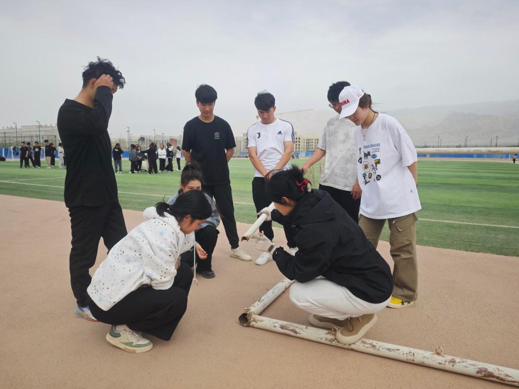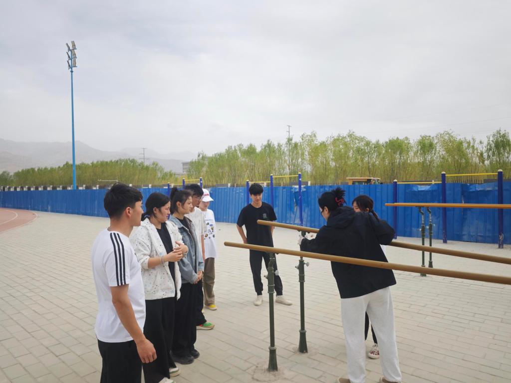 在田径场上,王晓蓓教师为加强校园体育设施器材安全管理,带领学生重点检查足球门、体操双杠等大型体育设施,对可能存在安全隐患的设备进行登记,对检查中发现的问题能处理的当场解决,不能处理的及时联系后勤维修人员。