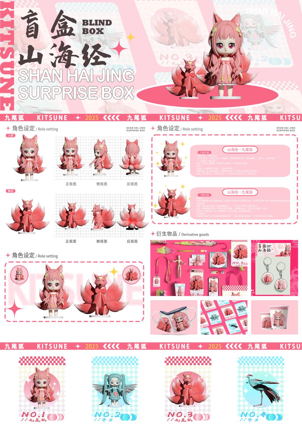 以《山海经》神兽九尾狐、毕方为原型,设计双形态形象,融入现代元素,配套周边及包装,实现传统与潮玩结合。
