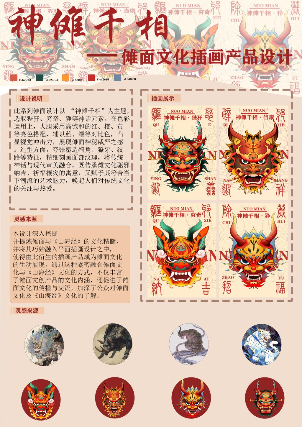 “神傩千相”插画以傩面为核,融《山海经》神兽,高饱和色调与夸张造型重构传统,架起文化沟通桥梁。