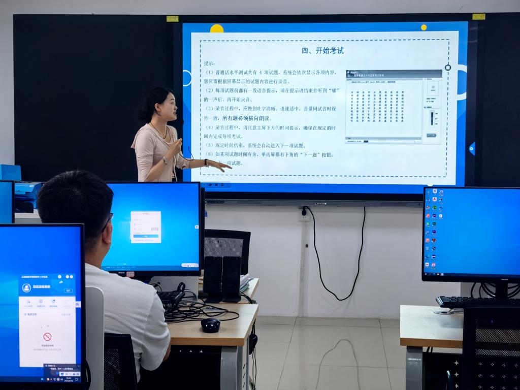 培训聚焦测试核心要点与实操技能。主讲教师首先详细讲解了测试注意事项,重点强调发音清晰准确、避免漏读错读、克服方言语调,并对语速控制、“儿化音”处理等常见问题进行了规范示范。随后,培训设置上机模拟测试环节,依托计算机辅助测试系统,完整还原单音节字词朗读、命题说话等考试流程,帮助学员熟悉试音操作、时间把控等关键细节。培训最后阶段,教师针对学员在模拟中暴露的普遍性发音问题进行了集中指导和纠正,通过实时交流强化重点难点训练。