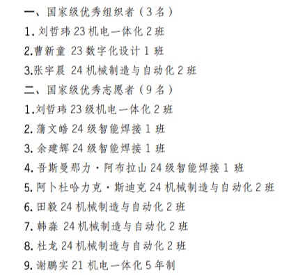6月21日,机械电气工程学院团总支公布了获奖情况公告,表彰在此次竞赛中获得优异成绩的个人。其中,3名学生获评国家级“优秀组织者”,9名学生获评国家级“优秀志愿者”,另有7名学生获评学院级“优秀志愿者”。
