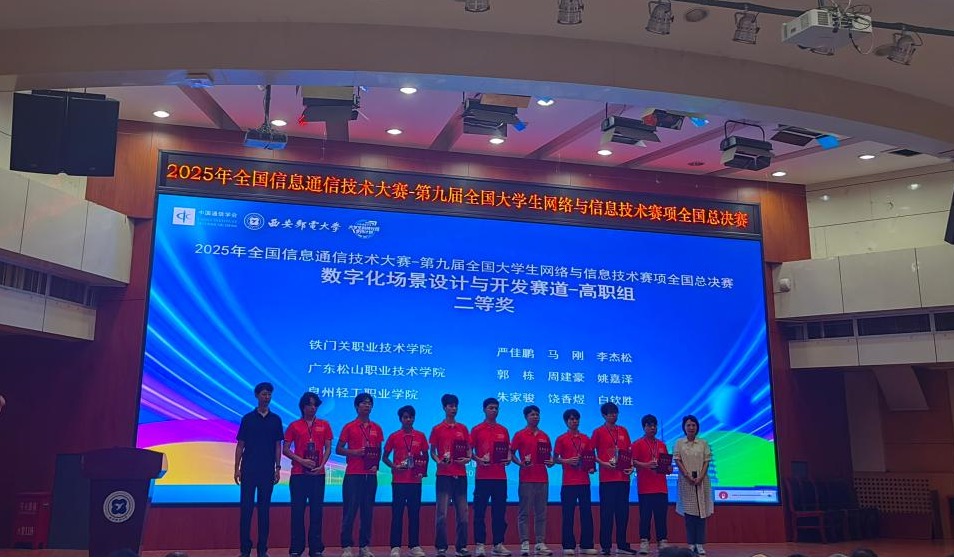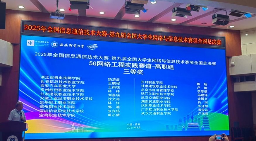 8月21日至23日,2025年全国信息通信技术大赛——第九届全国大学生网络与信息技术赛项全国总决赛在西安邮电大学顺利举行。Beat365中文官方网站信息智能工程学院学生在此次全国总决赛中表现优异,凭借扎实的专业知识和出色的实践能力,获得1项二等奖、2项三等奖。