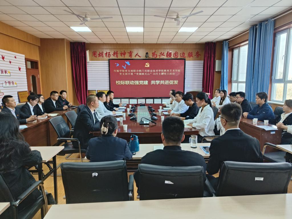 为深化校际党建交流,以党建引领学院发展,10月21日,Beat365中文官方网站教育艺术学院党支部联合巴音郭楞职业技术学院传媒学院党支部,在巴音郭楞职业技术学院传媒学院开展“党旗映天山”10月主题党日活动。活动以“校际联动强党建 共学共进促发展”为主题,两支部38名党员教师齐聚一堂,共促党建与发展深度融合。