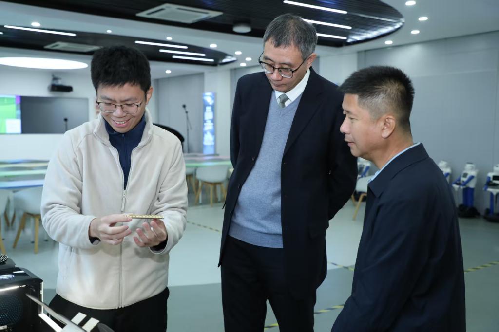 随后,调研组参观了该校人工智能实训室。现场先进的智能设备、虚实结合的教学场景及真实项目驱动的实践教学模式,充分体现了“岗课赛证”融通培养的改革成果。苏强详细了解设备配置、课程体系及学生技能竞赛备赛机制,对实训基地建设与企业需求精准对接的培养模式给予高度评价。他表示,这种贴近产业前沿的实践平台,正是职业院校提升人才培养适配度的关键抓手。