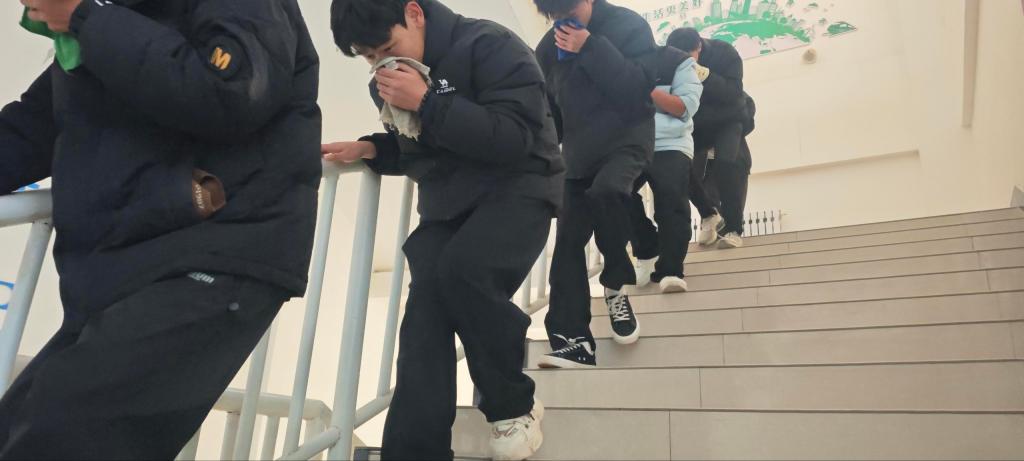 在应急疏散模拟环节,用音响模拟火情警报,各班依托教室与走廊布局开展应急疏散演练,提前规划疏散路线、明确逃生通道及集合点。学生在班主任及安全员引导下,弯腰捂口鼻有序撤离,平均用时1分30秒。演练后各班主任点评细节问题,结合教室设施演示临时避难技巧,提升学子应急反应能力。