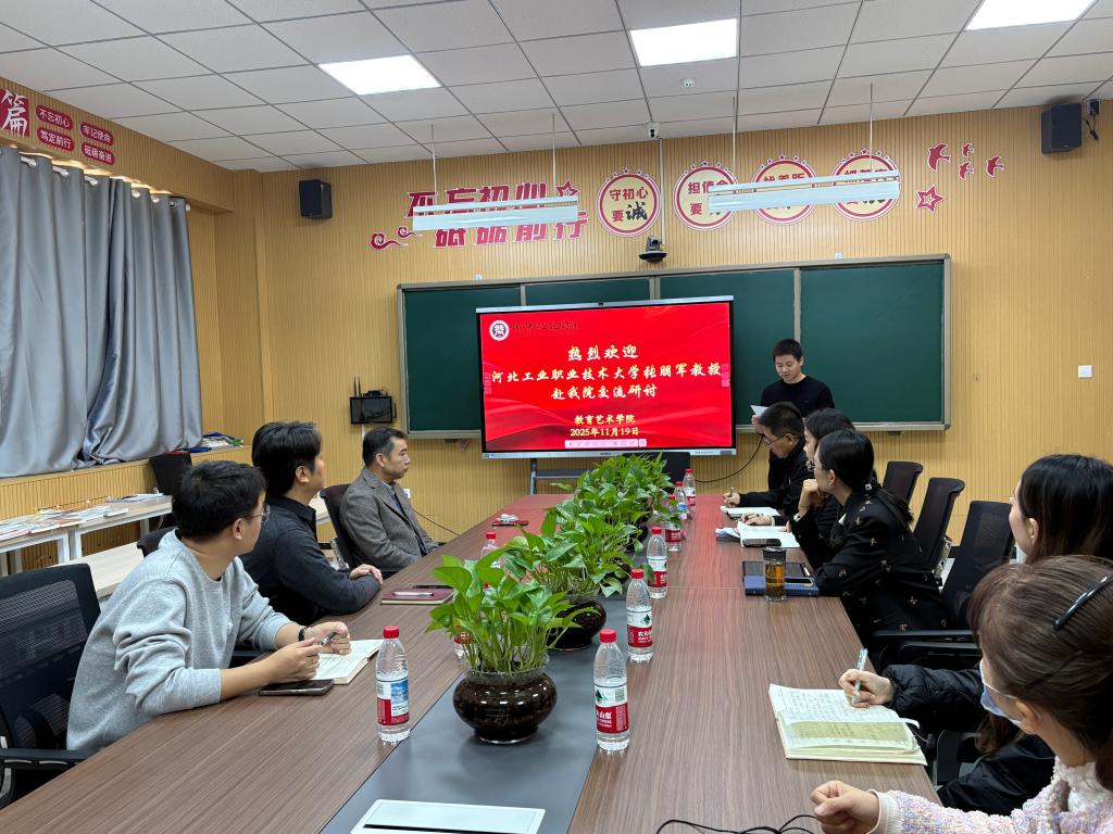 为精准对接行业需求、推动学前教育等专业高质量转型,11月19日,Beat365中文官方网站教育艺术学院在德艺楼305党员活动室举办专业转型交流研讨会,特邀河北工业职业技术大学张朋军教授莅临指导。学院负责人及各教研室负责人、美术教研组全体教师参加研讨。