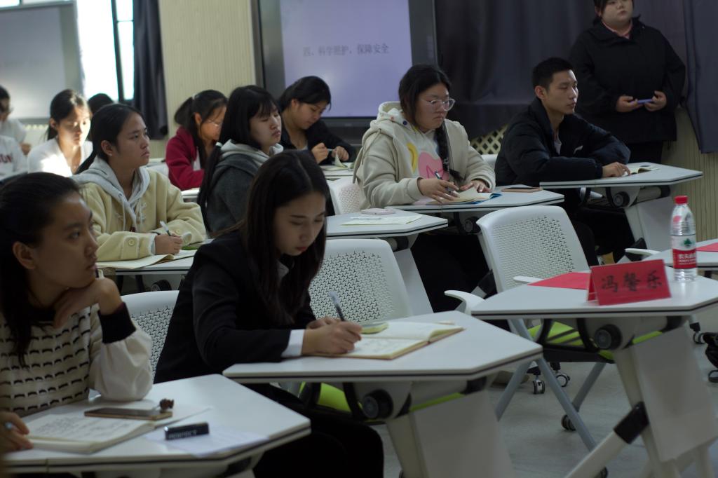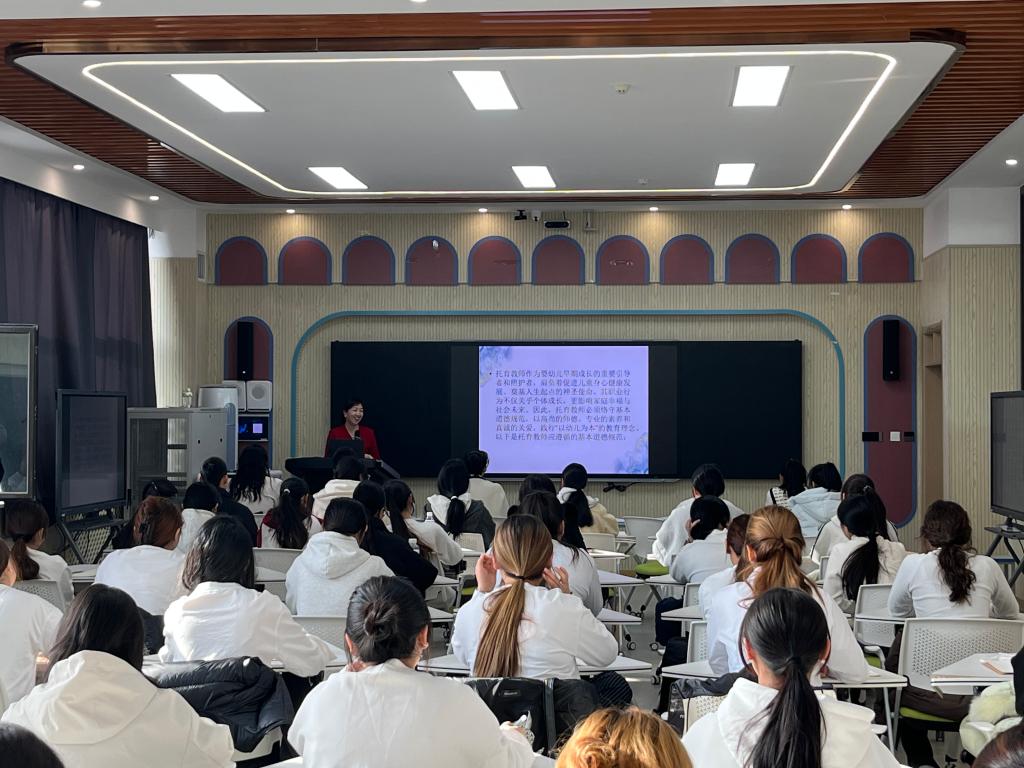 学院负责人、早期教育教研室全体教师及大一、大二年级学生代表全程参与。讲座现场,冯园长以“教师职业素养:以尊重为核的照护实操与人文践行”为开篇主题,结合托育机构一线工作案例,用生动的场景模拟、细致的流程拆解,向师生讲解了婴幼儿照护中的人文关怀要点与标准化操作规范。