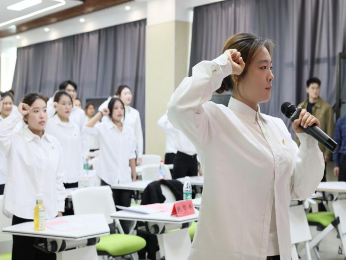 仪式在庄严的国歌中拉开序幕,随后现场宣读了经班级考察、学院审查、校团委批准的88名新团员名单。与会领导为新团员逐一颁发团员证、佩戴团徽,那枚闪耀的团徽与厚重的团员证,成为青春责任与信仰的鲜明印记。在领誓人马兰雪的带领下,新团员面向鲜红团旗庄严宣誓,铿锵誓言响彻全场,定格下青年学子矢志不渝的信念。