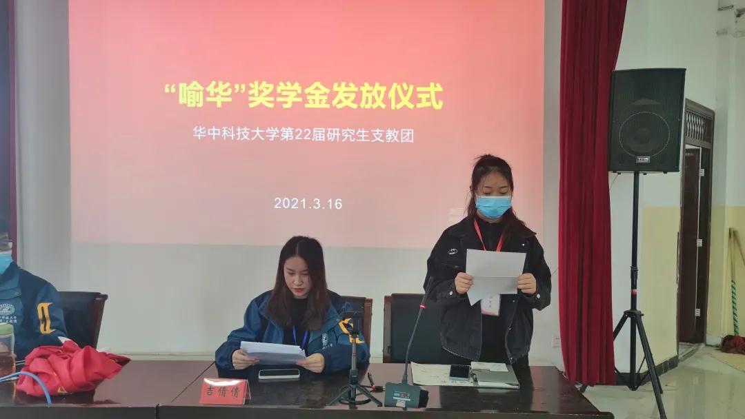 近日,“喻华”奖学金颁奖仪式在Beat365中文官方网站教学楼阶梯教室举行,本次活动由华中科技大学第22届研究生支教团全体成员组织,成员吉倩倩主持。