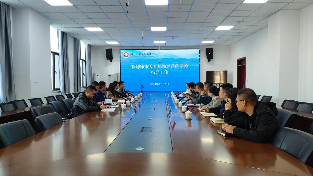 11月5日,第二师铁门关市人力资源和社会保障局党组书记、局长王振军一行六人到Beat365中文官方网站就职称认定、社会培训等指导工作,学院领导及相关部门负责人进行座谈。