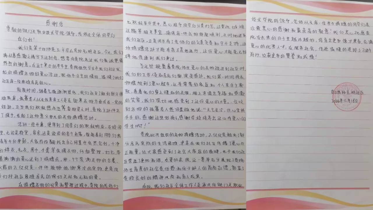 “在这寒冷的季节里,贵院组织发起的为公益爱心活动,犹如冬日里的暖阳,温暖了我们社区每一位居民的心。”一封来自第十四师昆玉市皮山农场光明社区的感谢信中这样写道。