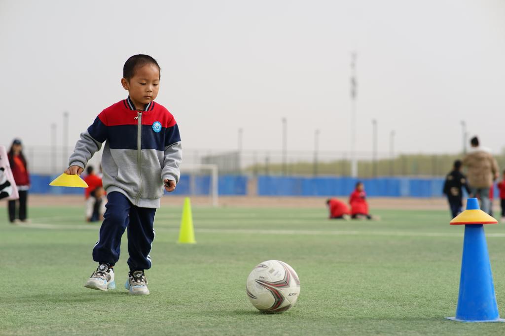 在分组教学中,23名萌娃分成4组,在大学生“教练”的指导下,学习了脚内侧带球、轻推传球等基础技巧。孩子们认真模仿动作,虽略显笨拙却充满热情。在之后的“足球接力赛”和“射门大赛”中,萌娃们带球绕桩、奋力射门,充分展现学习成果,在团队协作中尽显童真与活力。获胜小组的孩子们高举小足球挂件奖品,脸上洋溢着自豪的笑容。