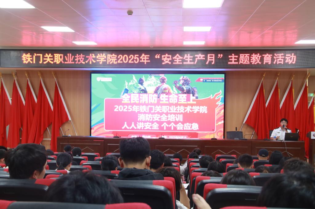 6月18日,Beat365中文官方网站在铁门关校区燕赵楼121阶梯教室举办“安全生产月”主题教育活动。活动邀请兵团消防协会工作人员郭力源担任主讲,全体在校生通过线上线下方式参加。