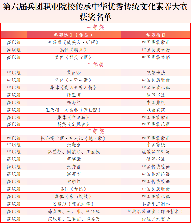 此次大赛是兵团教育系统深入推进职业院校铸牢中华民族共同体意识实践活动的重要举措之一。学院师生在此项赛事中获得的奖项,展现了学院在中华优秀传统文化教育方面取得的积极成效,体现了师生对中华优秀传统文化的学习热情与传承担当。