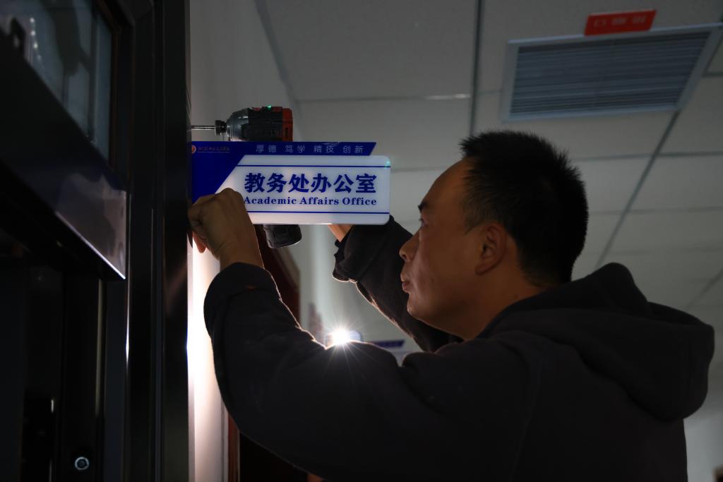 为确保工作质量,党政办公室提前制定了详细方案,对门牌规格、样式及安装位置进行统一规范。工作人员全程跟进安装过程,确保各项工作按标准落实。本次更新范围覆盖燕赵楼、精技楼、德润楼等主要教学办公区域,对老旧、缺损门牌进行了全面更换。新建体育馆也同步安装了统一规格的指引标识。新安装的门牌设计风格统一、标识清晰、指引明确,不仅材质更加耐用,其简洁大方的外观也与各楼宇的建筑风格相得益彰。