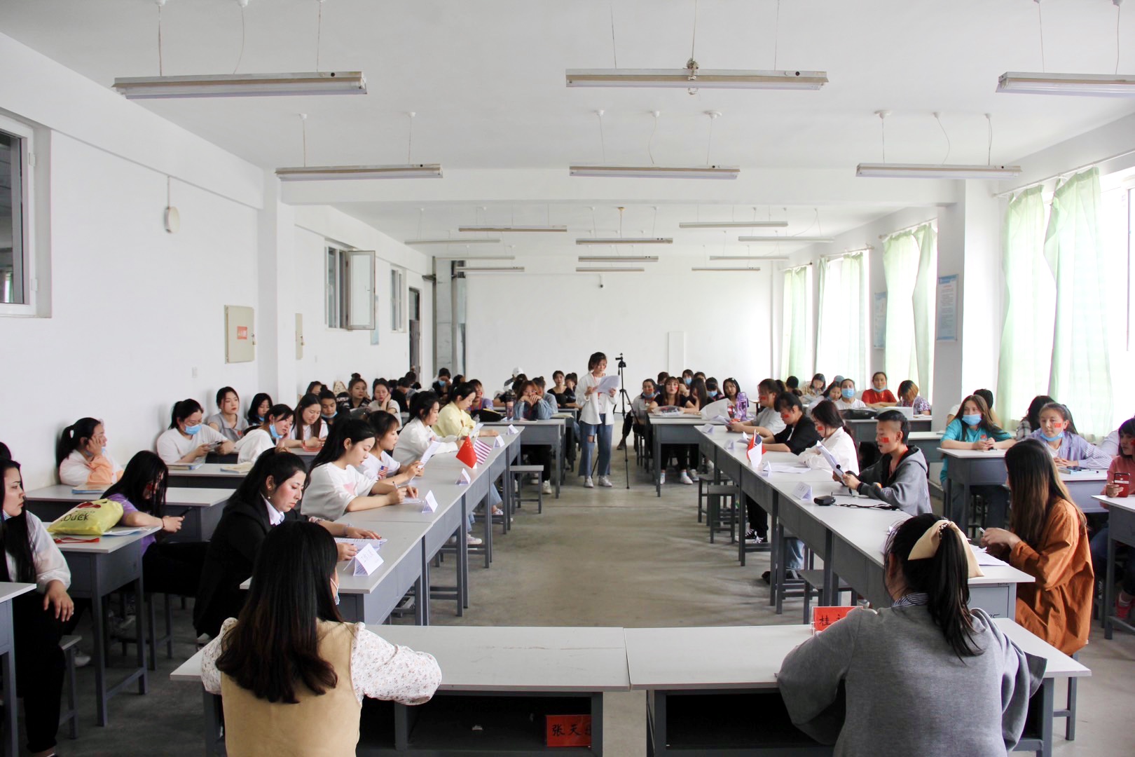 活动现场,桌面上放置着中、美国旗,学生代表分别模拟中方和美方。教室前方的黑板上还绘制了“中美高层对话”的主题黑板报,与播放的“十月围城”背景音乐相得益彰。