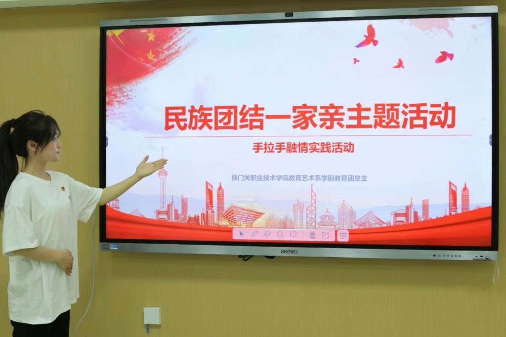 学院教育艺术系团总支部在铁门关校区举办了以“民族团结一家亲”为主题的活动,同学们通过卡片制作和石榴籽印手印的方式,让各族同学手拉手,共绘民族团结同心圆。