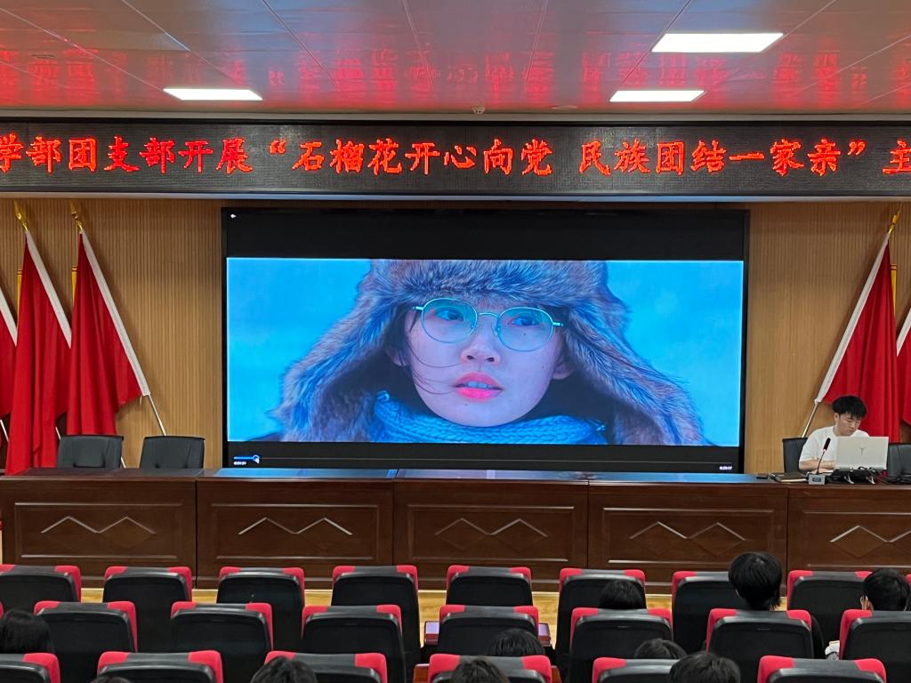 学院思政教学部团总支部在铁门关校区燕赵楼121阶梯教室开展“石榴花开心向党 民族团结一家亲”主题团日活动,一百余名团员师生参加。