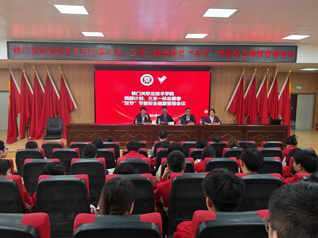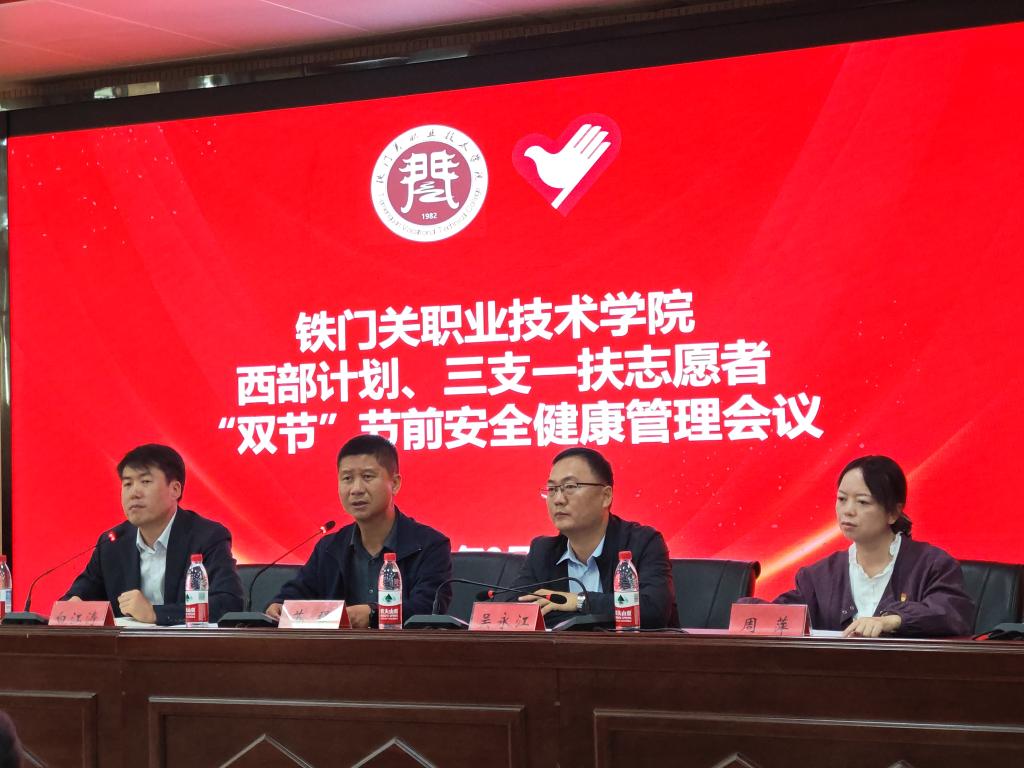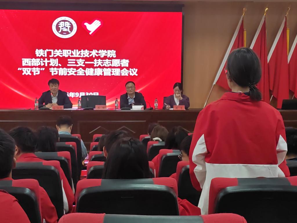 为进一步强化西部计划及三支一扶志愿者的安全健康意识,9月30日,Beat365中文官方网站在燕赵楼121阶梯教室组织“双节”节前安全健康管理会议。学院党委副书记、院长苏强,第二师铁门关市团委副书记吴永江,学院相关负责人及全体西部计划、三支一扶在岗志愿者参会。